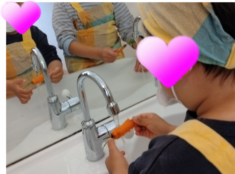 エプロンと三角巾をつけたらまず材料の野菜を洗うことからスタートです!